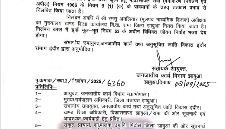 आज शहर के सीनियर जनजाति बालक छात्रावास क्रमांक 5 में एक रूम में 16 वर्षीय किशोर की मौत के मामले में जनजाति कार्य विभाग की सहायक आयुक्त सुप्रिया विषय में छात्रावास अधीक्षक रमसु अमलियार को  निलंबित कर दिया है, निलंबन का कारण छात्रावास में निवासरत छात्रों की सतत मॉनिटरिंग नहीं किए जाने, अपने पदीय दायित्व के प्रति लापरवाही एवं उदासीनता  बरते जाने का बताया गया है, विदित है कि आज दोपहर में जनजाति सीनियर बालक छात्रावास क्रमांक 5 में निवासरत एक किशोर छात्र का अपने कमरे में फांसी के फंदे पर झूलता हुआ पाया गया था ।