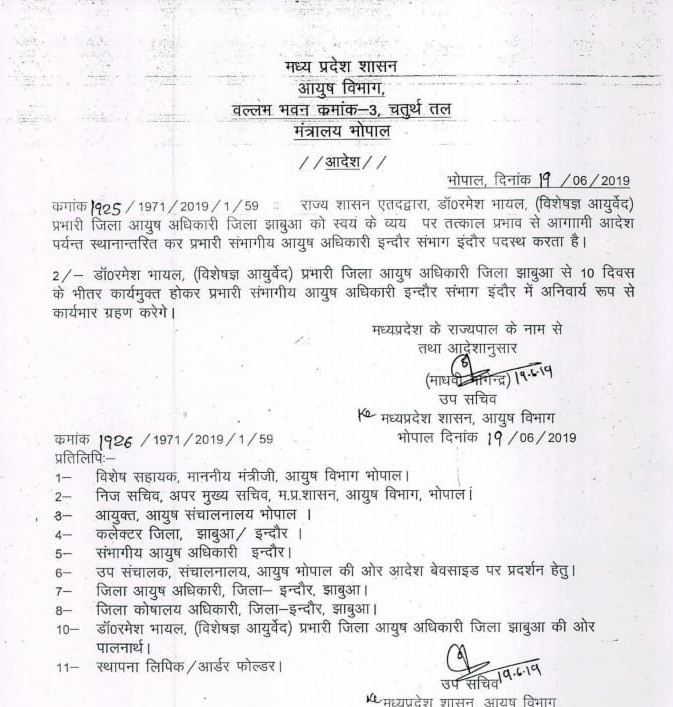 मप्र शासन में झाबुआ के जिला आयुष अधिकारी डॉ.रमेश भायल को एक बड़ी जिम्मेदारी देते हुए इंदौर संभाग के संभागीय आयुष अधिकारी के पद पर पदस्थ कर दिया है। मप्र शासन के आयुष विभाग की उपसचिव माधवी नागेंद्र ने यह आदेश जारी किया। इस नियुक्ति पर आयुष विभाग के झाबुआ जिले के अधिकारियों-कर्मचारियों ने डॉ.भायल को शुभकामनाएं एवं बधाई दी।