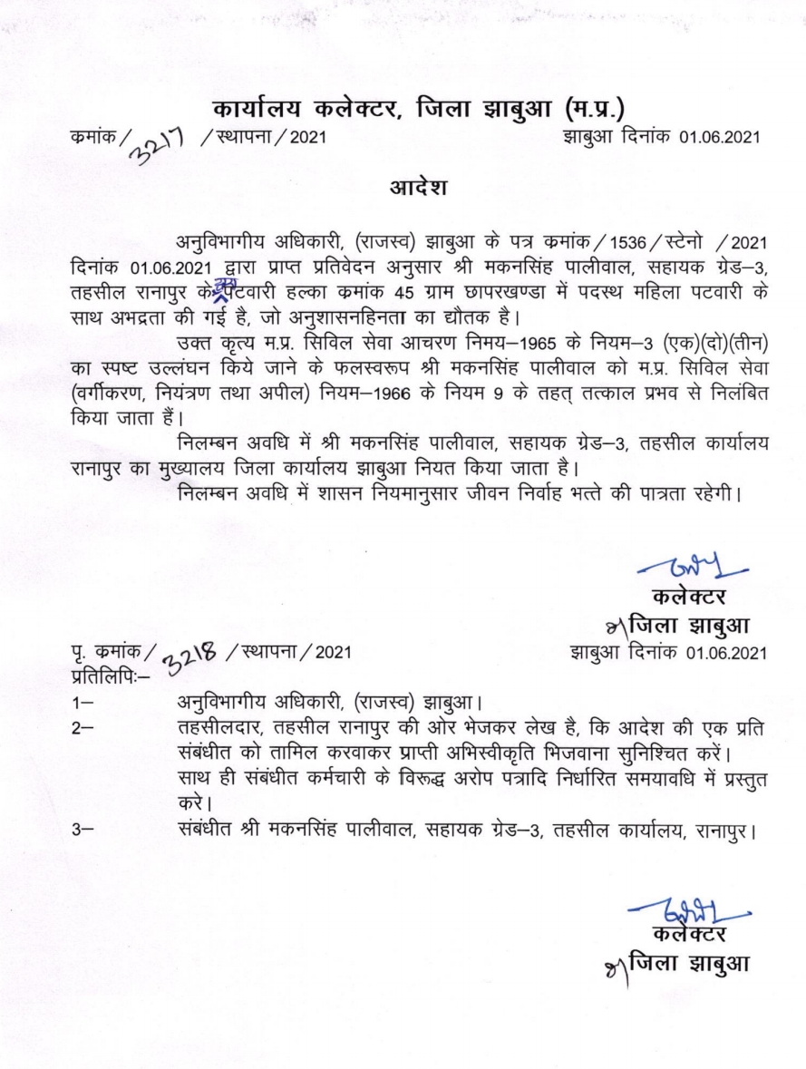 कलेक्टर सोमेश मिश्रा ने आदेश में बताया महिला पटवारी के साथ जो अभद्रता ओर अनुशासनहिनता की है, वह कृत्य मप्र सिविल सेवा आचरण नियम-1965 के नियम-3 (एक)(दो)(तीन) का स्पष्ट उल्लंघन किये जाने के फलस्वरूप मकनसिंह पालीवाल को मप्र सिविल सेवा (वर्गीकरण, नियंत्रण तथा अपील) नियम-1966 के नियम 9 के तहत तत्काल प्रभाव से निलंबित किया जाता है।