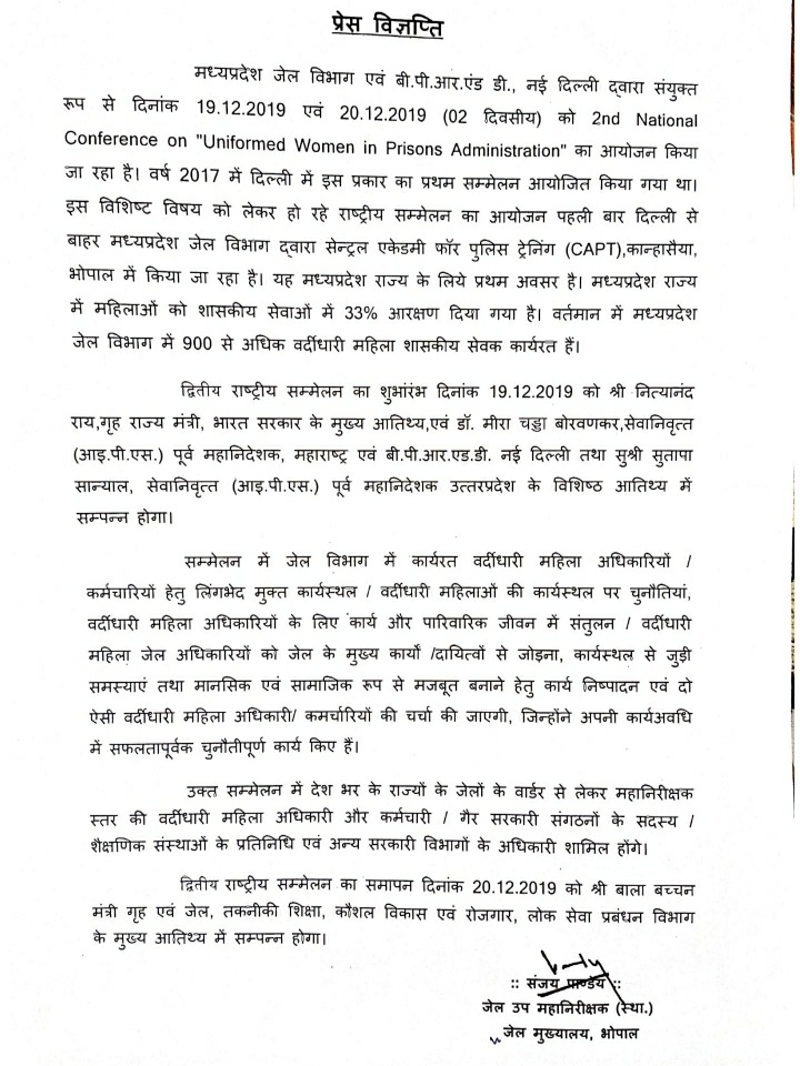 यह मध्य प्रदेश राज्य के लिए प्रथम अवसर है मध्य प्रदेश राज्य में महिलाओं को शासकीय सेवाओं में 33% आरक्षण दिया गया है। वर्तमान में मध्य प्रदेश जेल विभाग में 900 से अधिक वर्दीधारी महिला शासकीय सेवा कार्यरत है। द्वितीय राष्ट्रीय सम्मेलन का शुभारंभ आज श्री नित्यानंद राय (ग्रह राज्यमंत्री भारत सरकार) के मुख्य आतिथ्य में एवं डॉ मीरा चड्डा बोरवणडकर (सेवानिवृत्त पूर्व महानिदेशक महाराष्ट्र) एवं बीपी आर एड डी नई दिल्ली तथा सुश्री सूतापा सान्याल सेवानिवृत्त आईपीएस पूर्व महानिदेशक यूपी के विशिष्ट आतिथ्य में संपन्न होगा। यह जानकारी जिला जेल प्रभारी राजेन्द्र विश्वकर्मा द्वारा दी गई।