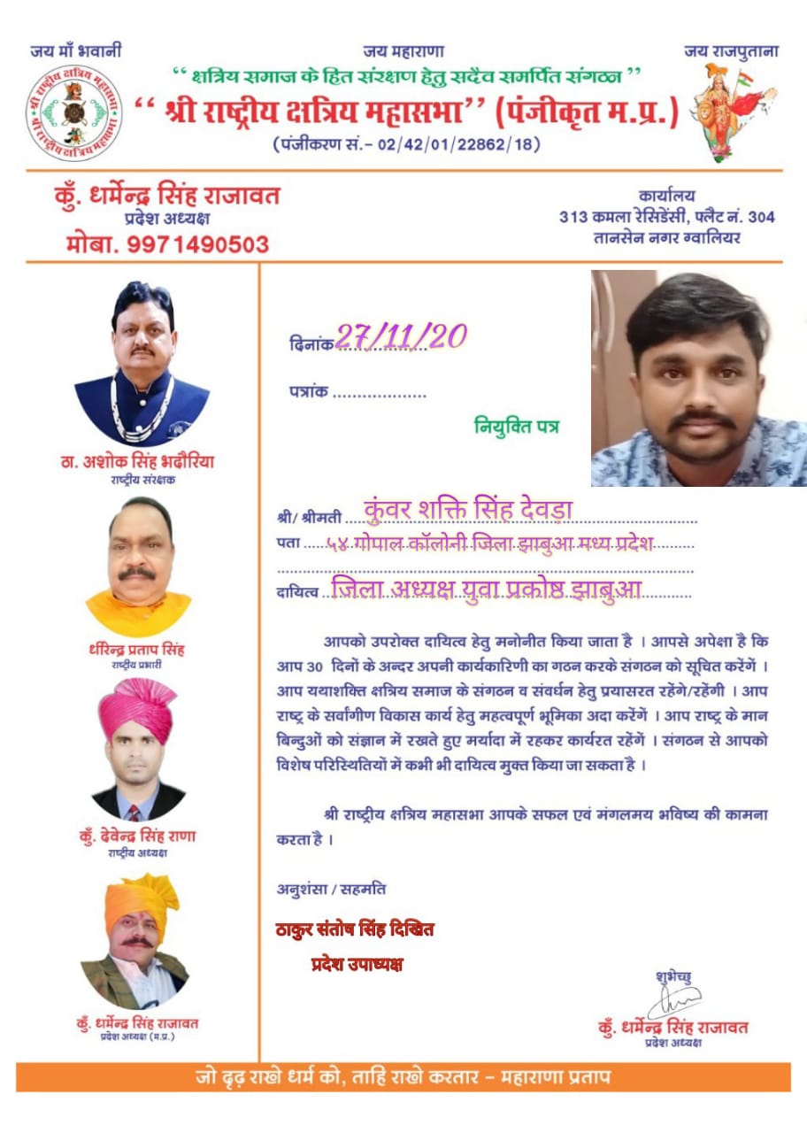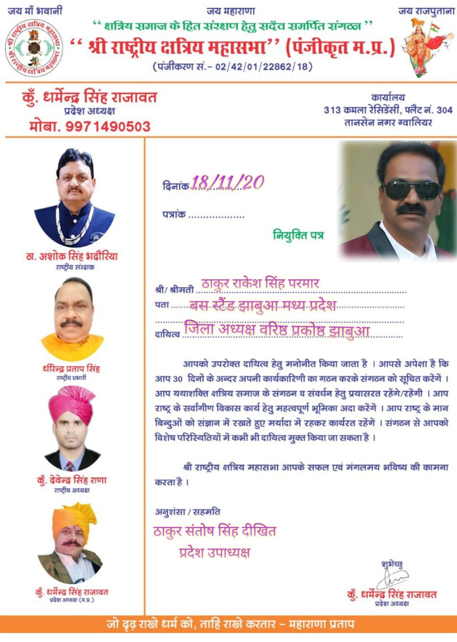 श्री राष्ट्रीय क्षत्रिय महासभा के प्रदेश अध्यक्ष कुंवर धर्मेंद्र सिंह राजावत, प्रदेश उपाध्यक्ष ठाकुर, संतोष सिंह दीक्षित एवं ठाकुर अरविंद सिंह सिकरवार की अनुशंसा पर राकेश परमार जिला अध्यक्ष वरिष्ठ प्रकोष्ठ झाबुआ एवम कुवर शक्ति सिंह देवड़ा जिला अध्यक्ष युवा प्रकोष्ठ झाबुआ के पद पर मनोनीत किया गया ।
