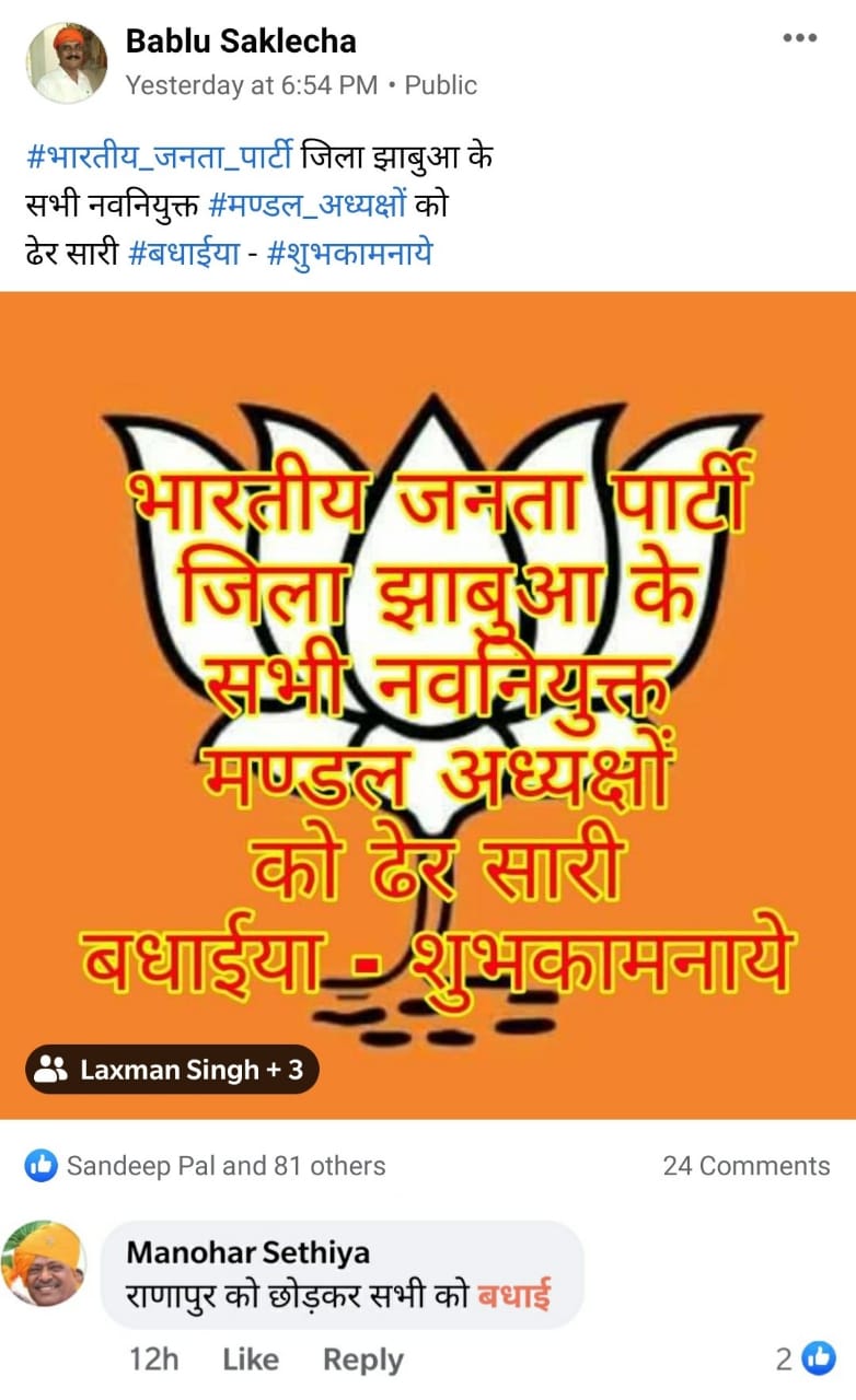 बीजेपी के पूर्व जिलाध्यक्ष मनोहर सेठिया को अपने ग्रह नगर राणापुर का मंडल अध्यक्ष कीर्तिश राठोड को बनाया जाना नागवार गुजरा है नाराज सेठिया ने बकायदा फैसबुक पर बिना कीर्तिश राठोड का नाम लिये अपनी प्रतिक्रिया दी है बबलू सकलेचा की फैसबुक पोस्ट पर कमेंट करते हुऐ सेठिया ने लिखा कि सभी मंडल अध्यक्षों को बधाई राणापुर को छोडकर .. ।