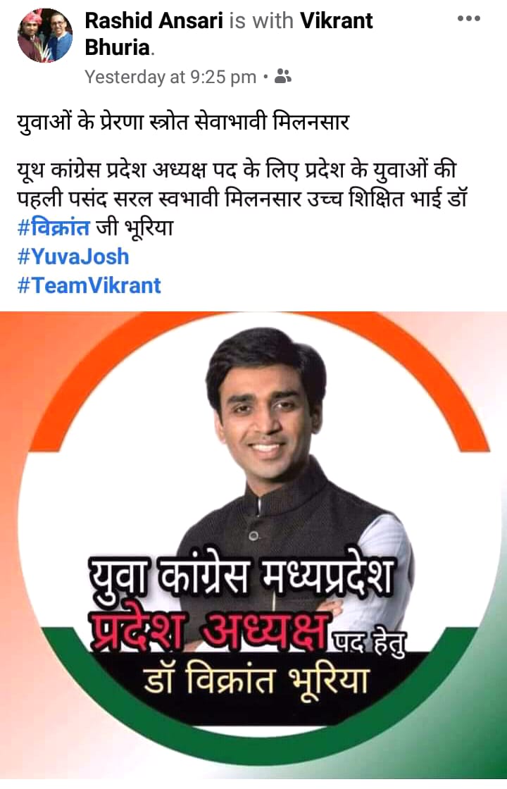 इधर कांग्रेस खेमे से खबरें आ रही है कि झाबुआ विधायक कांतिलाल भूरिया के पुत्र डाक्टर विक्रांत भूरिया मध्यप्रदेश युवक कांग्रेस के अध्यक्ष पद पर दावेदारी करने जा रहे है प्रदेश की 21 % आदिवासी आबादी होने ओर आदिवासी लीडरशिप को आगे लाने के विजन को आधार बनाकर भूरिया मैदान मे आयेंगे ..सुत्र बताते है कि दिग्विजय सिंह ओर कमलनाथ की हरी झंडी शायद डाक्टर विक्रांत भूरिया को मिल गयी है इसलिऐ भूरिया दावेदारी के मूड मे है हालांकि अभी तक खुलकर विक्रांत भूरिया ने दावेदारी पेश नही की है लेकिन सोशल मीडिया पर उनके समथ॔क हैशटैग चलाना शुरु कर चुके है ।