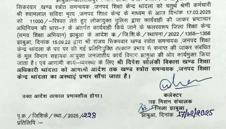 लोकायुक्त पुलिस की कार्यवाई के बाद थांदला बीआरसी सिकरवार कार्यमुक्त