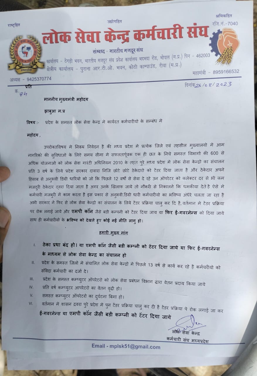 लोक सेवा केंद्र के कर्मचारियों के दावरा आज मुख्यमंत्री शिवराज सिंह चौहान को ज्ञापन दिया गया जिसमे मुख्य मांग ठेकदारी प्रथा बंद हो निजी ठेकेदार को टेंडर ना दिया जाय और ई गावरनेस के माध्य्म से संचालन किया जाय व जो पिछले 13 वर्षो से ऑपरेटर कार्य कर रहे उन्हें सविंदा या ई गावरनेस के माध्यम से किया जाय या तो बड़ी कम्पनी को टेंडर दिया जिससे ऑपरेटर को समान वेतन वा pf बीमा जैसी सुविधा मिल सके पिछले 12 वर्षो से सेवा दे रहे है एक छत के निचे 700 से अधिक सेवाएं हम दे रहे फिर भी सरकार दावरा हमारा शोषण किया जा रहा है इससे पहले भी हम मामा को ज्ञापन दे चुके है अब हम अनिश्चित हड़ताल करने को मजबूर किया जा रहा है।