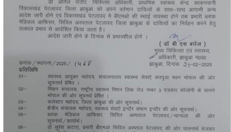 झाबुआ सीएमएचओ द्वारा एक आदेश जारी किया गया है, जिसमे बताया कि डॉ सुरेश कटारा, प्रभारी ब्लाक मेडिकल आफिसर सिविल अस्पताल पेटलावद स्वास्थ्य समिति की बैठक दिनांक 21-02-2025 को विकासखंड पेटलावद अन्तर्गत संचालित राष्ट्रीय कार्यक्रमो की सही जानकारी प्रस्तुत नहीं करने, पेटलावद विकासखंड अन्तर्गत सीएम हेल्प लाईन में अधिक प्रकरण दर्ज होने, एवं समय-समय पर इनके विरूद्ध प्राप्त शिकायतों के आधार पर इन्हें प्रभारी ब्लाक मेडिकल आफिसर, सिविल अस्पताल पेटलावद जिला झाबुआ के दायित्वों से तत्काल प्रभाव से मुक्त किया जाता है। वही डॉ अनिल राठौर, चिकित्सा अधिकारी, प्राथमिक स्वास्थ्य केन्द्र काकनवानी जिला झाबुआ को अपने वर्तमान दायित्वों के साथ-साथ आगामी अन्य आदेश जारी होने एवं विकासखंड पेटलावद मे बीएमओ की स्थाई व्यवस्था होने तक प्रभारी ब्लाक मेडिकल आफिसर, सिविल अस्पताल पेटलावद जिला झाबुआ के दायित्वों का निर्वहन करने हेतु तत्त्काल प्रभाव से आदेशित किया जाता है।