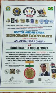 मुंबई की माया नगरी में राष्ट्रीय रत्न अवार्ड एवं राष्ट्रीय मानवाधिकार महिला बाल विकास आयोग का वार्षिक स्नेह सम्मेलन कार्यक्रम आयोजित किया गया जिसमें देश के 15 लोगों को अलग-अलग राज्यों से आए 15 व्यक्तियों को ब्राजील आई एम यू टी यूनिवर्सिटी से आई कुलपति ( चांसलर) डॉ. दीप्ति भदोरिया के हाथों डॉक्टरेट की मानद उपाधि से अलंकृत किया गया है। जिसमें मध्यप्रदेश के झाबुआ जिले से लंबे समय से समाज सेवा के क्षेत्र में कार्य कर रहे अशोक बलसोर भी डॉक्टरेट की मानद उपाधि से नवाजा गया।