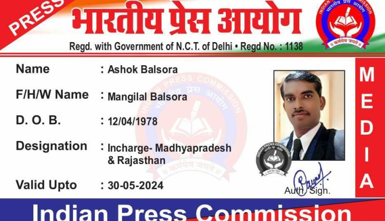 अशोक बलसोरा भारतीय प्रेस आयोग में मध्य प्रदेश और राजस्थान के प्रदेश प्रभारी नियुक्त