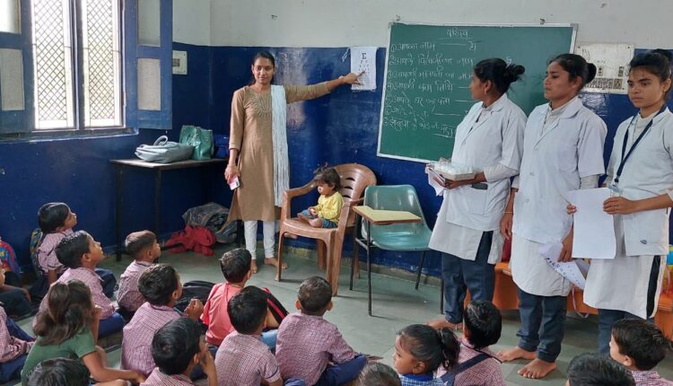 झाबुआ। आई फ्लू की जो नई बीमारी पूरे देश में चल रही है उसके सम्बन्ध में स्थानीय माँ त्रिपुरा कालेज आफ नर्सिंग की छात्राओं द्वारा स्थानीय शारदा विद्या मंदिर की गोपाल कालोनी शाखा मे आई फ्लू के संक्रमण से बचाव हेतु आवश्यक निर्देश दिए और जिन विद्यार्थियों की आंखें संक्रमित लगी उन्हें जाँच के बाद आई ड्रॉप भी वितरित की।