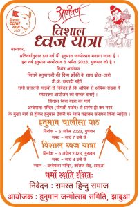 प्रति वर्ष अनुसार इस वर्ष भी श्री हनुमान जन्मोत्सव समिति झाबुआ द्वारा विशाल ध्वज यात्रा हनुमान जन्मोत्सव के उपलक्ष्य में निकाली जा रही है, कल यानि 6 अप्रैल को श्री अंबे माता मंदिर कॉलेज रोड से शाम 4:00 बजे प्रारंभ होने वाली विशाल ध्वज यात्रा नगर के प्रमुख मार्गो से होते हुए श्री संकट मोचन हनुमान मंदिर हनुमान टेकरी पर पहुँचेगी, ध्वज यात्रा में ढोल – ताशे, आकर्षक झांकी ,एवं डीजे की धुन पर थिरकते युवा आकर्षण का केंद्र रहेंगे, श्री हनुमान जन्मोत्सव समिति झाबुआ द्वारा पूरे शहर वासियों से विशाल ध्वज यात्रा में ज्यादा से ज्यादा संख्या में पधार कर आयोजन को सफल बनाने की अपील की है।