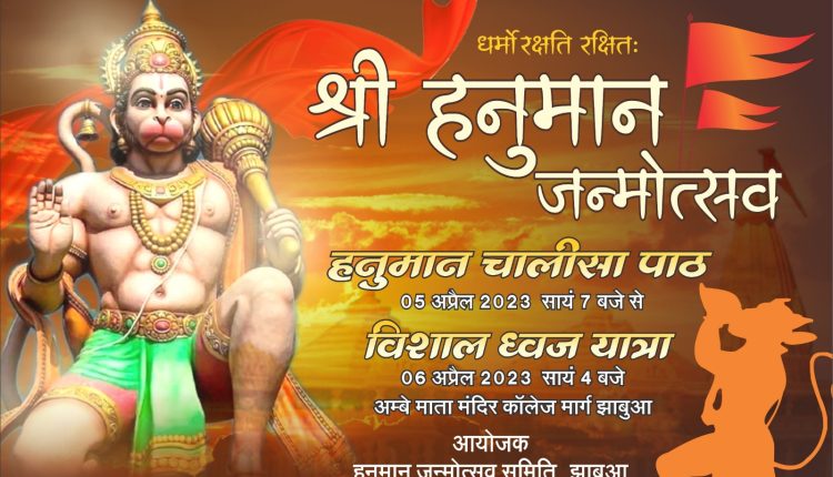 प्रति वर्ष अनुसार इस वर्ष भी श्री हनुमान जन्मोत्सव समिति झाबुआ द्वारा विशाल ध्वज यात्रा हनुमान जन्मोत्सव के उपलक्ष्य में निकाली जा रही है, कल यानि 6 अप्रैल को श्री अंबे माता मंदिर कॉलेज रोड से शाम 4:00 बजे प्रारंभ होने वाली विशाल ध्वज यात्रा नगर के प्रमुख मार्गो से होते हुए श्री संकट मोचन हनुमान मंदिर हनुमान टेकरी पर पहुँचेगी, ध्वज यात्रा में ढोल – ताशे, आकर्षक झांकी ,एवं डीजे की धुन पर थिरकते युवा आकर्षण का केंद्र रहेंगे, श्री हनुमान जन्मोत्सव समिति झाबुआ द्वारा पूरे शहर वासियों से विशाल ध्वज यात्रा में ज्यादा से ज्यादा संख्या में पधार कर आयोजन को सफल बनाने की अपील की है।