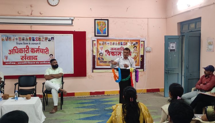 जनजाति विकास मंच आलीराजपुर के बैनर तले शिक्षक दिवस के अवसर पर अधिकारी-कर्मचारी संवाद कार्यक्रम संपन्न किया। इस मौके पर संवाद कार्यक्रम के मुख्यवक्ता डाँ.सखाराम मुजाल्देविभाग अध्यक्ष जनजाति अध्ययन एवं विकास केंद्र डीएवीवी इंदौर थे, उन्होंने कहा कि समाज में हमारी जो अस्मिता और अस्तित्व है उसे बचाना सबका कर्तव्य है। शिक्षक की जिंदगी स्कूल से है शिक्षित और अशिक्षित दोनों में बहुत बड़ा अंतर है, हम शिक्षित है पर हमारी भाषा और संस्कृति अलग-अलग है। हमारी जिम्मेदारी गढने और बनाने की है, हम दूसरों को दोष नहीं दे सकते चूकिं हम व्यक्तिगत बचाव की ओर जा रहे जबकि हमें समाज बदलाव की ओर जाना चाहिए, क्योंकि शिक्षा जगत से समाज का उद्धार हो सकता है। हम जिस समाज में रहते है, उस समाज की संस्कृति, रीति-रिवाज, परंपरा और रूडी प्रथाओं को जीवित रखना आने वाली पीढ़ी के लिए महत्वपूर्ण बताया। अपने स्वतंत्रता संग्राम मे जनजाति नायकों के योगदान मे बताया कि पुरुषों के साथ महिलाओं की महत्वपूर्ण भूमिका बताते हुए कहा कि भारत सरकार ने 2024 में जनजाति अध्ययन केंद्र देवी अहिल्या विश्वविद्यालय इंदौर में स्थापित किया है, जहां पर जनजाति समाज के बच्चें अब पीएचडी कर सकेंगे, उसके बारे में उन्होंने जानकारी देते हुए कहा कि इसके लिए पुस्तकें तैयार की जा रही और निचले स्तर पर भी भारत सरकार के सहयोग से बहुत जल्दी जनजाति अध्ययन केंद्र की स्थापना होने की बात भी की।