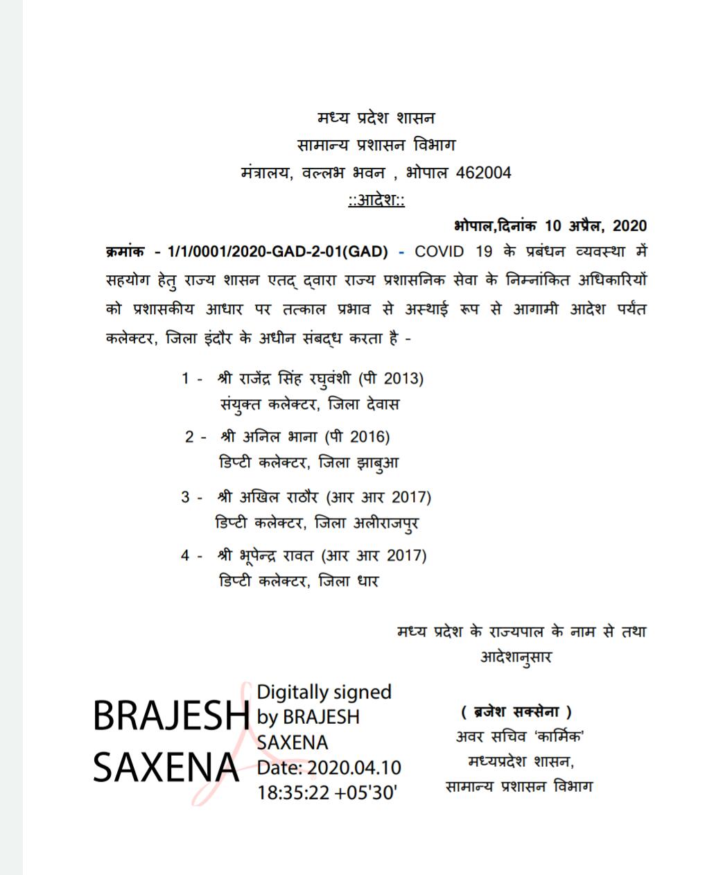 जोबट एसडीएम अखिल राठोड की सक्रियता को देखते हुए प्रशासन ने कोरोना से जंग के लिए तत्काल इंदौर में पदस्थ करने का आदेश दिया है ।कोरोना वायरस से इंदौर में कई केस पॉजिटिव मिल चुके हैं और कई लोगों की मौत भी हो गई है। ऐसे में प्रशासन इस स्थिति को संभालने में वहां दिक्कत हो रही है ।इंदौर में पूर्व पदस्थ अधिकारियों को भेजा जा रहा है उसमें जोबट एसडीएम अखिल राठोड भी शामिल है