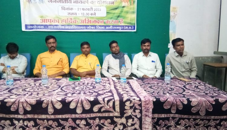 जोबट महाविद्यालय परिसर में राष्ट्रीय अनुसूचित जनजाति आयोग नई दिल्ली एवं देवी अहिल्या विश्वविद्यालय के संयुक्त तत्वाधान में आजादी के अमृत महोत्सव के तहत स्वतंत्रता संग्राम में जनजातीय नायकों के योगदान विषय पर संगोष्ठी आयोजित की गई और इस मौके पर मुख्य वक्ता के रूप में खेम सिंह जमरा भीमा नायक वनांचल सेवा संस्था के प्रदेश सचिव ने महापुरुषों के अनेक नाम और उनके दायित्व के साथ ही कार्य का बखान किया और इतिहास में इन सारे महापुरुषों के नाम अंकित नहीं होने के बारे में सभी को जानकारी से अवगत करवाते हुए कहा है कि कोई जनजाति समाज के महापुरुष जिन्होंने देश की आजादी के लिए अपना जीवन बलिदान कर दिया। ऐसी कई घटनाएं हुई जो जनजाति समाज को ऊपर नहीं आने देने के चलते उनके नाम इतिहास के पन्नों पर अंकित नहीं है। उनका जीवन परिचय कहीं से कहीं तक उल्लेख नहीं किया गया, इस देश के तारे महापुरुष हम सबके रहे है, लेकिन जिन लोगों ने देश के समाज पर आक्रमण किया है उन आक्रमण कर्ताओं का नाम और जीवन परिचय इतिहास के पन्नों पर अंकित किया गया। लेकिन हमारे सर्व समाज के योद्धाओं का नाम कहीं से कहीं तक उल्लेख नहीं होना बताया। उसी को लेकर यह कार्यशाला आयोजित की जा रही ताकि हमारे जनजातीय को का इतिहास सामने आ सके।