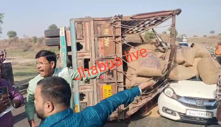 गेंहू से भरा आयशर ट्रक पलटा, ट्रक के नीचे दबी कार