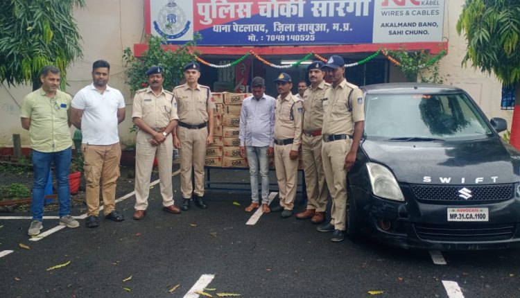 थाना पेटलावद के अंतर्गत चौकी सारंगी पुलिस ने अवैध शराब के परिवहन पर एक बड़ी कार्रवाई करते हुए एक आरोपी को गिरफ्तार किया है। यह कार्रवाई पुलिस अधीक्षक झाबुआ और अतिरिक्त पुलिस अधीक्षक के निर्देशन में, एसडीओपी पेटलावद और थाना प्रभारी प्रदीप वाल्टर के नेतृत्व में की गई। पुलिस टीम ने मारुति स्विफ्ट कार से अवैध रूप से ले जाई जा रही 26 पेटी गोवा व्हिस्की जब्त की। कार पर एडवोकेट लिखी पट्‌टी लगी थी।