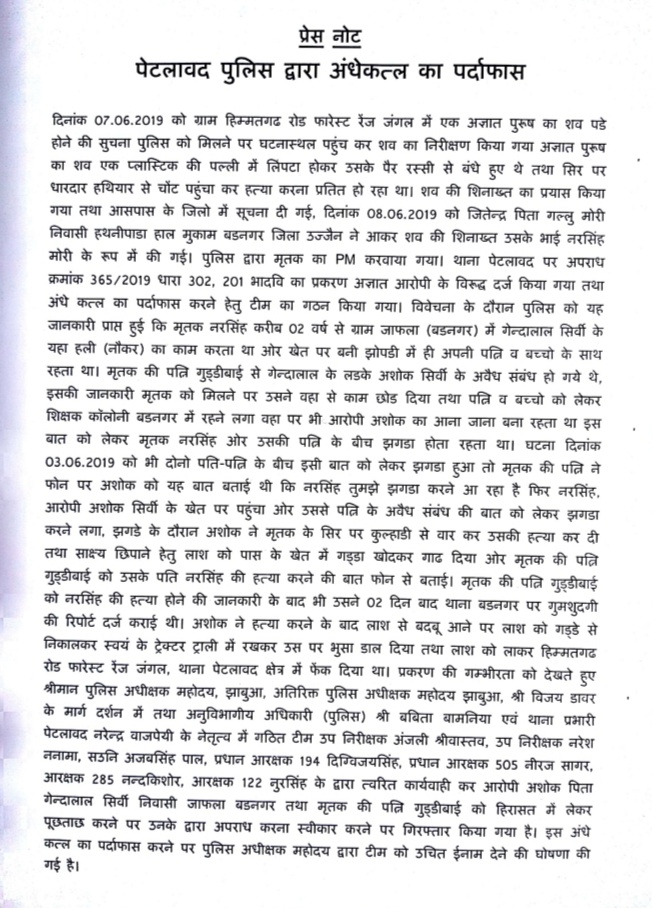 बीते दिनों पेटलावद के ग्राम हिम्मतगढ़ के फॉरेस्ट रेंज जंगल में अज्ञात युवक का क्षत-विक्षत शव मिलने से सनी सनसनी गई थी पुलिस में 6 दिनों में अंधे कत्ल का खुलासा करने में सफलता प्राप्त की है।