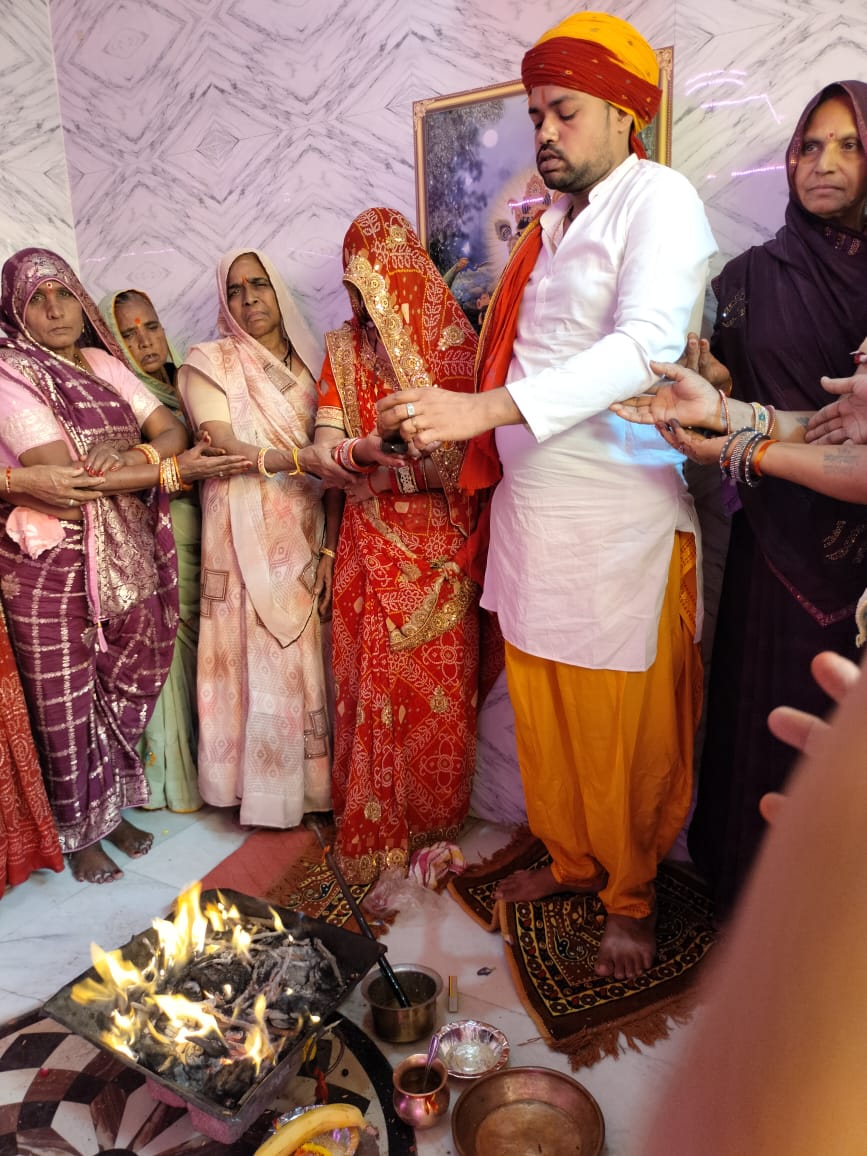 पेटलावद। गुरुवार को कुंज गली पेटलावद में स्थित श्री राधा कृष्ण मन्दिर पर गवली समाज द्वारा श्री राधा कृष्ण का अभिषेक और हवन कर व पूर्णाहुति में छप्पन भोग अर्पण किया गया इस दौरान विश्व की मंगलकामना के साथ पूर्णाहुति की गई। और सनातन धर्म में चौमासे में वर्जित सभी सब्जियों का भोग लगाकर सभी को भोजन प्रसादी वितरित की गई। श्री कृष्ण नवयुवक मण्डल के तत्वाधान में यह कार्यक्रम आयोजित किया गया था।
