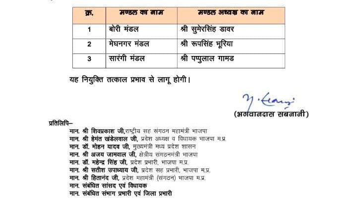 भारतीय जनता पार्टी द्वारा आज झाबुआ जिले के तीन मंडल अध्यक्ष हेतु एक सूची जारी की है, जिसमें पेटलावद क्षेत्र अंतर्गत आने वाले भाजपा के सारंगी मंडल में पप्पू गामड़ को अध्यक्ष के पद पर मनोनीत किया गया है। पप्पू गामड़ बैगनबर्डी के निवासी है। और पेटलावद विधायक एवं कैबिनेट मंत्री निर्मला भूरिया के करीबी माने जाते हैं। तो वहीं जिले के बोरी मंडल में सुमेर सिंह डावर और मेघनगर में रूपसिंह भूरिया को मंडल अध्यक्ष बनाया गया है। गोरतलब है कि पूर्व में सभी मंडलों पर अध्यक्ष की घोषणा की जा चुकी थी शेष बचे मंडलों के अध्यक्ष भी आज घोषित किए जा चुके हैं। भारतीय जनता पार्टी द्वारा आज अगस्त के पहले दिन यह सूची जारी की गई है।