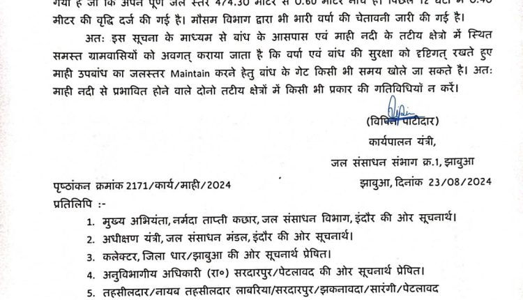 अतः इस सूचना के माध्यम से बांध के आसपास एवं माही नदी के तटीय क्षेत्रो में स्थित समस्त ग्रामवासियों को अवगत् कराया जाता कि वर्षा एवं बांध की सुरक्षा को दृष्टिगत् रखते हुए माही उपबांध का जलस्तर मेंटेन करने हेतु बांध के गेट किसी भी समय खोले जा सकते है। अतः माही नदी से प्रभावित होने वाले दोनो तटीय क्षेत्रों में किसी भी प्रकार की गतिविधियों न करें।