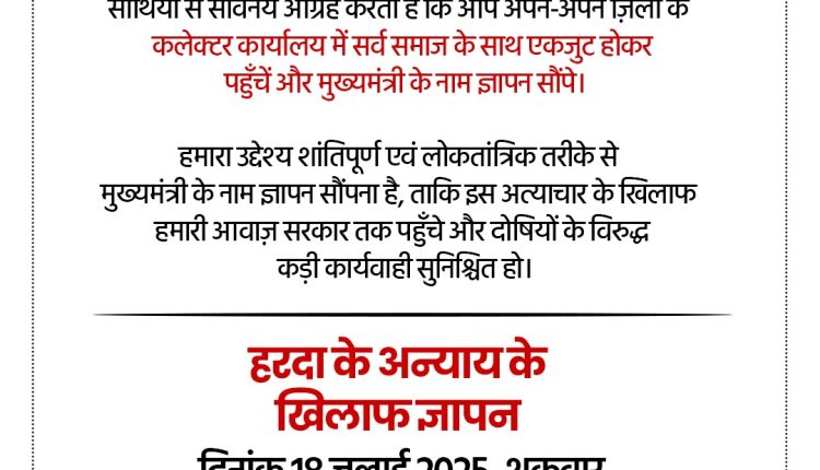 करणी सेना परिवार के संभाग अध्य्क्ष महेंद्र सिंह झकनावदा एवं जिलाध्यक्ष नीतिराज सिंह बोडायता ने बताया कि हरदा में शांतिपूर्ण तरीके से अपनी बात रख रहे करणी सेनिको एवं छात्रावास में मोजूद महिलाओ, बच्चो पर पुलिस-प्रशासन द्वारा बर्बरता पूर्वक लाठी चार्ज किया गया है। जिसके विरोध में पूरे प्रदेश में ज्ञापन दिए जा रहे है। एवं ज्ञापन के माध्यम से मांग की जाएगी कि पूरे प्रकरण की न्यायिक जांच करवाई जाए, जांच पूर्ण होने तक हरदा के पुलिस अधीक्षक, कलेक्टर एवं संबंधित थाना प्रभारी को प्रशासनिक दायित्वों से हटाया जाए, करणी सेना प्रमुख जीवन सिंह शेरपुर पर हमला करने वाले पुलिस कर्मियों पर भारतीय दंड संहिता की धारा 307 (हत्या के प्रयास) के अंतर्गत मुकदमा दर्ज किया जाए, छात्रावास एवं आम नागरिकों के साथ की गई बर्बरता, गाड़ियों को नुकसान एवं शांतिपूर्ण आंदोलन पर हमला करने वाले पुलिसकर्मियों के खिलाफ भी कड़ी कानूनी कार्रवाई की जाए, संविधान के अनुच्छेद 19(1)(b) के तहत प्रदत्त शांतिपूर्ण प्रदर्शन के अधिकार की रक्षा की जाए, हरदा प्रकरण में जिन निर्दोष व्यक्तियों पर झूठे प्रकरण दर्ज किए गए हैं, उन्हें अविलंब वापस लिया जाए तथा सुनील सिंह राजपूत एवं उनके साथ जिन साथियों को अभी तक पुलिस हिरासत में रखा गया है, उन्हें तुरंत प्रभाव से रिहा किया जाए, जिस प्रकार पुलिस ने हरदा के राजपूत छात्रावास में घुसकर मारपीट की, वह अत्यंत निंदनीय है। भविष्य में देशभर के किसी भी छात्रावास या शैक्षणिक संस्थान में ऐसी कार्रवाई की पुनरावृत्ति न हो, यह सुनिश्चित किया जाए। ऐसी कई मांगो को लेकर ज्ञापन सोपा जाएगा।