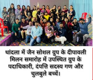 थांदला। जैन सोशल ग्रुप थांदला द्वारा दीपावली मिलन समारोह एवं अंताक्षरी प्रतियोगिता का आयोजन स्थानीय मेट्रो गार्डन पर किया गया। इस आयोजन में सभी सदस्यों ने बढ़ चढ़कर हिस्सा लिया। इस समारोह को लेकर ग्रुप का प्रत्येक सदस्य अतिउत्साहित था।