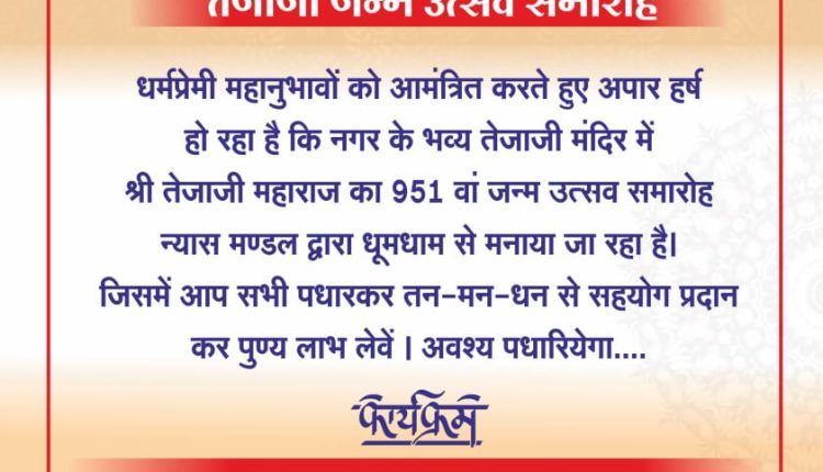 पांच दिवसीय तेजाजी जन्मोत्सव का तेजाजी न्यास मंडल थांदला द्वारा होगा भव्य आयोजन