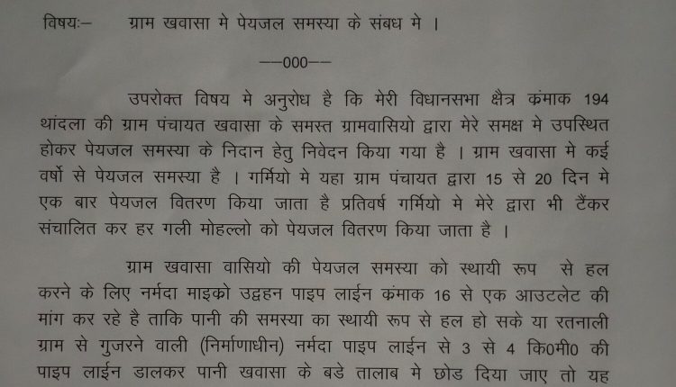 विधायक भूरिया ने किया खवासा की मांग का समर्थन ; नर्मदा लाने और जलसंकट के स्थायी हल के लिए मुख्यमंत्री-कलेक्टर को लिखा पत्र