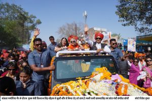 यहां से काफिला बाईपास होते हुए पुरानी मंडी पहुंचा। बीच में नगर परिषद कार्यालय पर परिषद अध्यक्ष बंटी डामोर, युवा भाजपा नेता राजेश वसुनिया ने ग्राम रुंडीपाड़ा में भाजपा नेता विश्वास सोनी एवं प्रदेश मंत्री संगीता सोनी ने स्वागत किया। जगह जगह स्वागत के उपरांत मुख्य कार्यक्रम स्थल पुरानी मंडी पहुंचे, जहां पहुंचते ही सी एम शिवराज सिंह चौहान एवं उनकी पत्नी साधना सिंह ने भगोरिया नृत्य कर रहे दलों के साथ जमकर नृत्य किया । जिसे देखकर उपस्थित जन समुदाय झूम उठा। जिसके उपरांत खुली जीप में आदिवासी समाज का अभिवादन करने हेतु सीएम शिवराज सिंह चौहान ने रोड शो किया, खुली जीप में सीएम शिवराज सिंह चौहान, साधना सिंह चौहान, सांसद गुमान सिंह डामोर, प्रदेश मंत्री संगीता सोनी उपस्थित रहे।