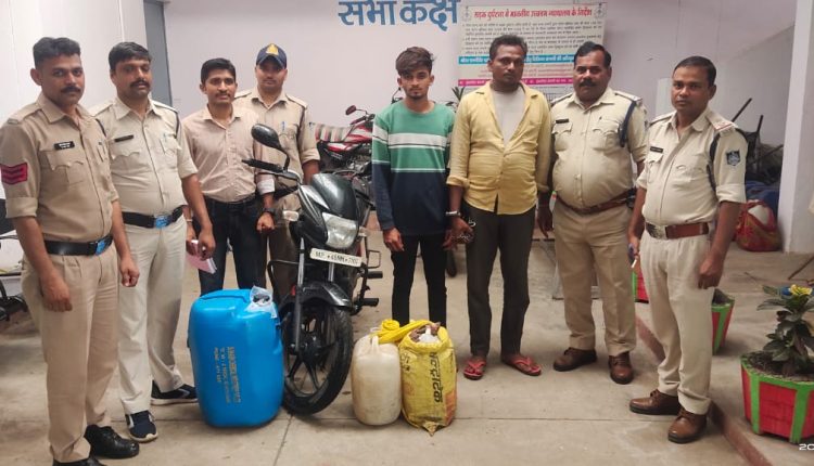 थांदला। आज दिनांक 05.07.2023 को मुखबीर द्वारा सूचनी मिली की पेटलावद रोड तरफ से दो व्यक्ति एक मोटरसायकल पर अवैध ताडी की कैने लेकर बैचने के लिये थांदला तरफ आयेंगे तब हमराह फोर्स लेकर थांदला-पेटलावद रोड नाहरपुरा खेजडा हनुमान मंदीर के पास पहुचे की तभी पेटलावद तरफ से एक काले रंग की मोटरसायकल पर दो व्यक्ति मोटरसयाकल के दोनो तरफ एक –  एक सफेद रंग की प्लास्टीक की कैन तथा एक नीले रंग की बडी प्लास्टीक की कैन बीच मे लेकर आते दिखे जिनको घेराबंदी कर पकडा जिनका नाम पता पुछते अपना नाम भारेसिंह पिता भूरा वाखला भील उम्र 30 साल निवासी पानकी व रणवीर पिता काशीराम डामोर उम्र 19 साल निवासी ग्राम गोलाबावडी थाना झाबुआ  के होना बताया । दोनो सफेद रंग की प्लास्टीक की कैनो मे भरी 15-15 लीटर पाउडर निर्मित ताडी तथा एक नीले रंग की प्लास्टीक की बडी कैन जिसमे 40 लीटर पाउडर निर्मित ताडी कुल 70 लीटर कीमती करीबन 14000 रूपये व घटना मे प्रयुक्त मोटरसायकल पेशन प्रो काले रंग की ,क्रमांक MP-45-MH-7107  को आरोपीगण भारेसिंह वाखला व रणवीर डामोर के कब्जे जप्ती की गई वापसी पर आरोपीगणों के विरूद्ध थाना थांदला पर अपराध क्रमांक 506/2023 धारा 34(2),49-A आबकारी एक्ट का कायम कर विवेचना में लिया गया।