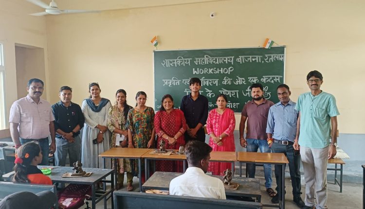 थांदला। शासकीय महाविद्यालय बाजना में प्रकृति एवं पर्यावरण की और एक कदम बढ़ाते हुवे मिट्टी के गणेशजी बनाने हेतु, आई क्यू ए सी , इको क्लब तथा एन एस एस के बैनर तले एक कार्यशाला का आयोजन किया गया , जिसमे थांदला नगर में नगर विकास समिति द्वारा आयोजित मिट्टी के गणेश बनाओ प्रतियोगिता के श्रेष्ठ विजेता , मास्टर चित्रांश रवि श्रीवास्तव ,कक्षा दसवीं ,अणु पब्लिक स्कूल के छात्र , थांदला का बाजना के छात्र छात्राओं को मिट्टी के गणेश बनाने का प्रशिक्षण देने के लिए चयन हुआ ।