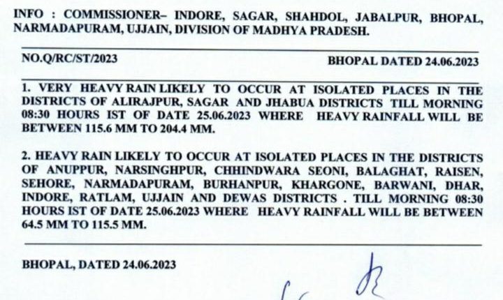 मध्य प्रदेश के कुछ जिलों में भारी बारिश की संभावना जताई जा रही है मध्य प्रदेश राहत आयुक्त द्वारा अग्रेषित एक वायरलेस संदेश के अनुसार कल मध्य प्रदेश के कई जिलों में भारी बारिश होने की संभावना बताई जा रही है । प्राप्त जानकारी अनुसार मध्य प्रदेश के अलीराजपुर, सागर और झाबुआ जिले में कल 25 जून 2023 को अलग-अलग स्थानों पर बहुत भारी बारिश होने की संभावना बताई जा रही है जहां पर बारिश की मात्रा 115 मिलीमीटर से 204 मिली मीटर के बीच होने की संभावना बताई जा रही है। भारी बारिश की संभावना की सूची में झाबुआ जिले को भी अलर्ट किया गया है।